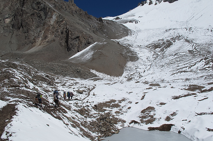 The overnight snowfall created no difficulties on the way to Camp 1. Note the obvious trail winding up the slope.