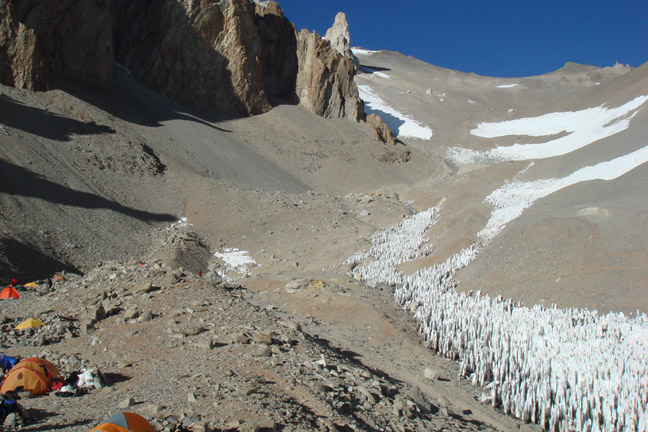 Camp 1 site. The route from this camp descends through the penitentes and up to the saddle at the top.