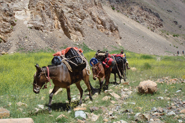 The mules bore the brunt of the loads to base camp.