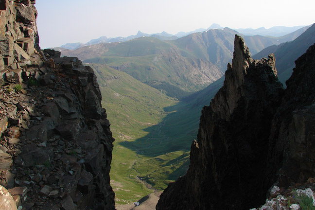 Looking east from the summit ridge with Coxcomb, Wetterhorn, Matterhorn, and Uncompaghre Peaks on the horizon, and American Basin below.