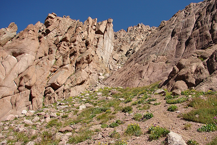 The correct gully (center, with the stripes on the left wall) if ascending only Animas Mtn from Ruby Basin.
