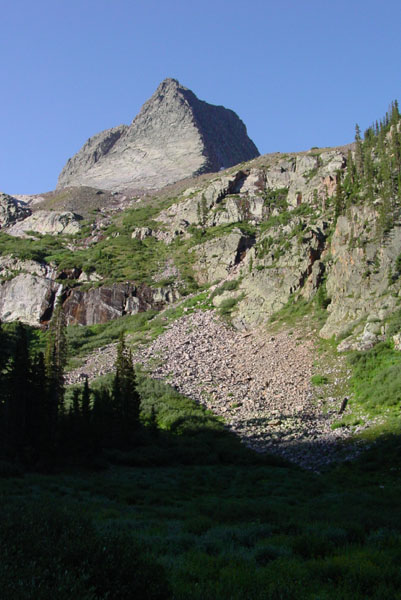 We went up the right side of the rock field and traversed to the grassy slopes, left of center.