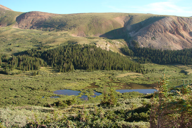 Tightly woven willows in the lower basin. My route stayed above and probably went better than staying low.