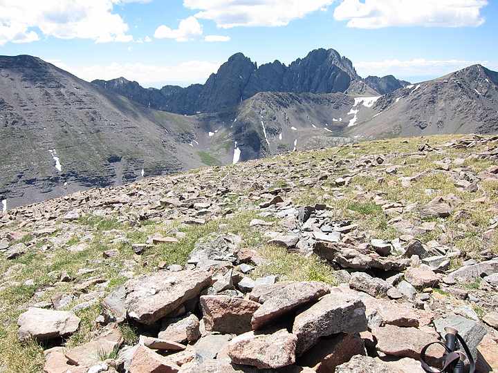 Crestone Needle and Crestone Peak from Colony Baldy's summit.
