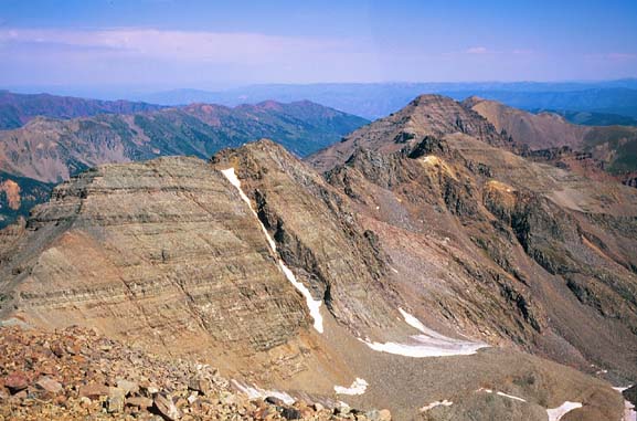 Conundrum Peak as seen from Castle Peak. The summits are split by the long gully with snow.
