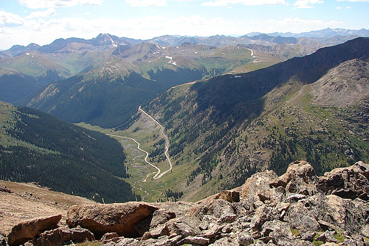Looking down from Mt Champion at the trailhead and parking area below Independence Pass.