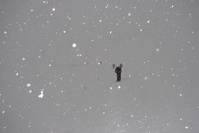 Just below the last stretch to the summit. Note the poles marking the route and the distant climbers bunched below.