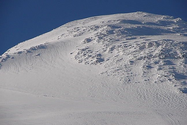 Mt Elbrus east summit. Note the hikers traversing (lower left) to the higher western summit.