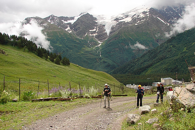 Olga, Dina, and Kevin on the road above Terskol with the Caucasus mountains in back.