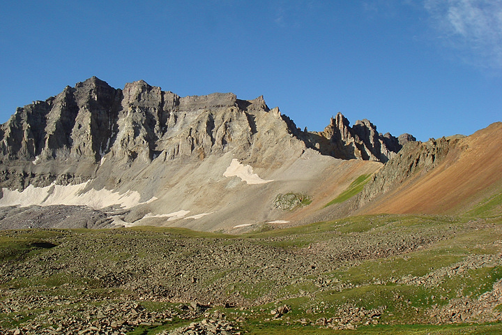Gilpin Peak, left. We headed up the grassy slopes to the saddle, right.