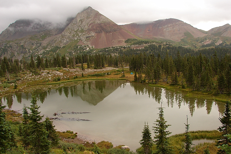 The trail passes above the unnamed lake on the way to Grizzly Peak. Note the tent on the other side.
