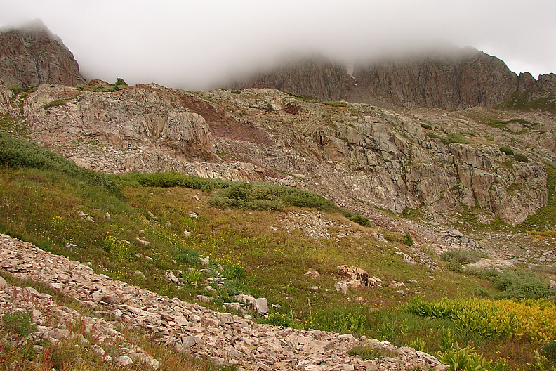 Low cloud cover obscuring Grizzly's cliffs and the snow-filled gully we ultimately climbed.