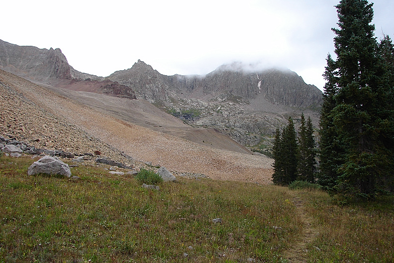 The view of Grizzly Peak (on our descent) and the snow-filled gully we ascended. The correct one is well left and leads to the saddle.