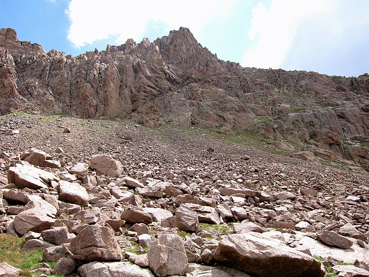 The ramp is seen straight ahead and angling to the right, under the tower.
