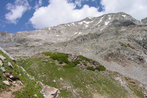 Hagerman Peak, distant center right, is the large bump on the ridge with a square shaped snowfield near the summit.