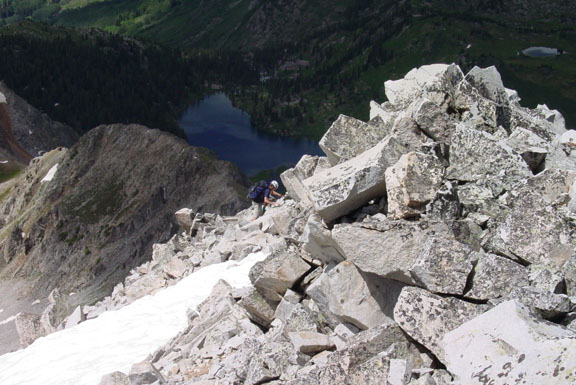 A climber ascending Hagerman's southwest ridge with Geneva Lake in the background.