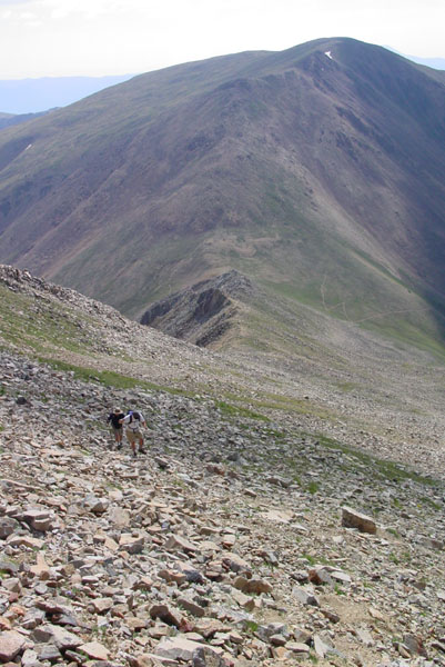 Mark and Art ascending the ridge above Hope Pass. Quail Mtn is the summit opposite the pass.