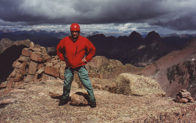 Threatening weather on top. The two prominent peaks to the right in the background are Arrow and Vestal.