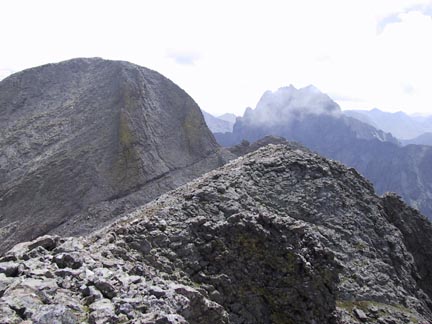 Kit Carson (the massive hump on the left) and Crestone Peak, with clouds swirling about its summit.
