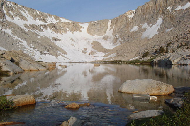 The last lake before reaching Old Army Pass. The steeper couloir to the right of the main couloir can also be climbed.