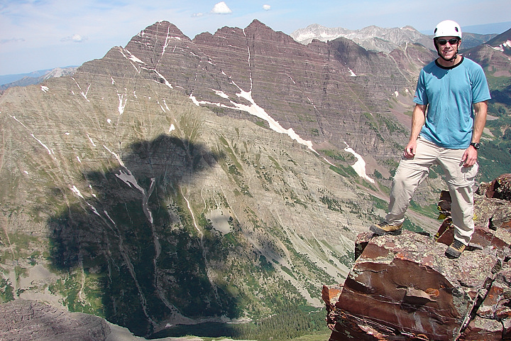 Jason on an exposed area of the summit with the Maroon Bells providing a scenic backdrop.