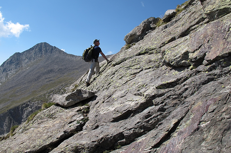 Tim ascending the east ridge with Tijeras Peak in the background.