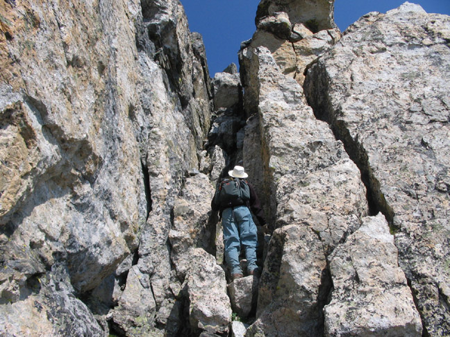 Two hard moves to get past the chockstone at the top. Photo courtesy of Tim Briese.