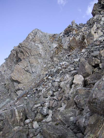 North Massive is top left in photo. The scree between the summit and the colored rocks is what we descended and it's worse than it looks!