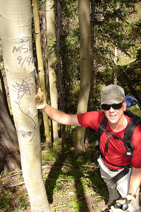 Columbine carving on the aspen tree.