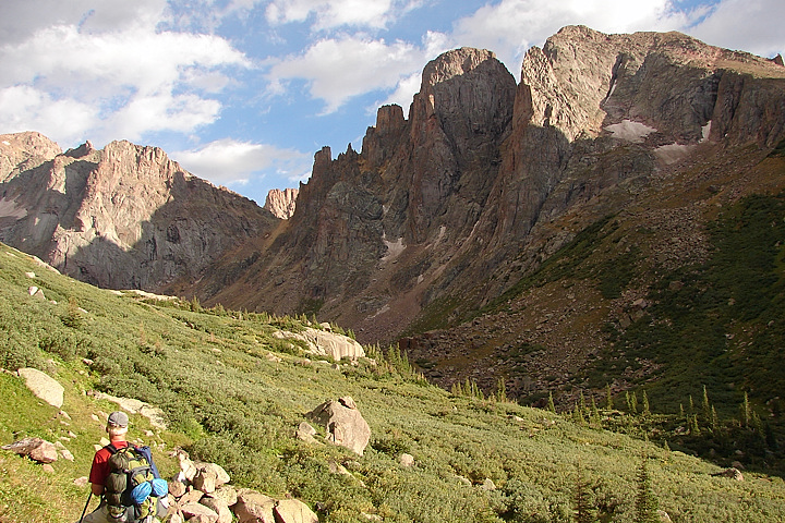 Approaching Ruby Basin and Peak 15. The peak with large flat slope on the right is Turret Peak, Peak 15 is to its left.