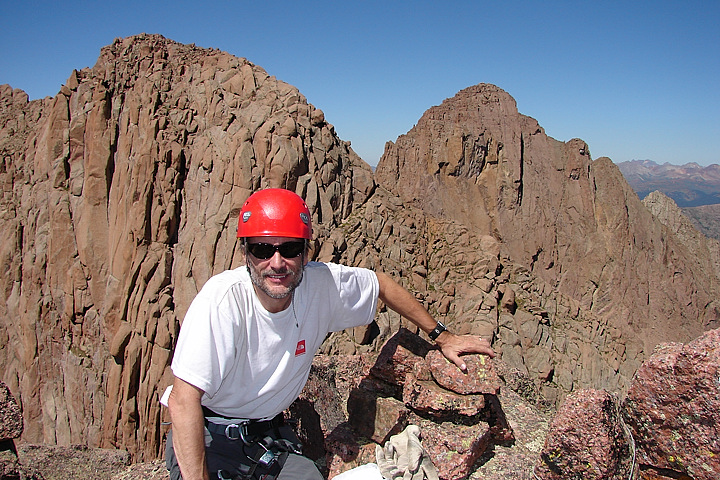 Enjoying the summit with Turret Peak (left) and Pigeon Peak (right) providing a scenic backdrop.