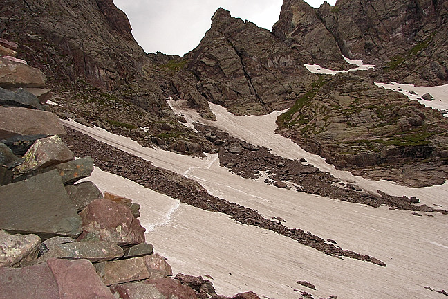 We needed our axes on the steep snow below the pass (photo was taken on the descent).