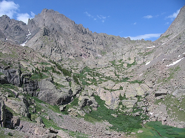 We contoured high above the drainage. You can see the creek, lower right, that drains Cottonwood Lake, which isn't seen but is located behind the large rocks atop the willows in the center. Photo courtesy of Tim Briese