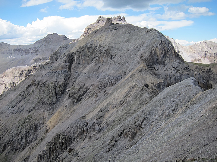 Nearing the saddle with the "Coffeepot" straight ahead (shaded). Teakettle Mtn looms behind it. Our shortcut traversed under the cliffs below Coffeepot.