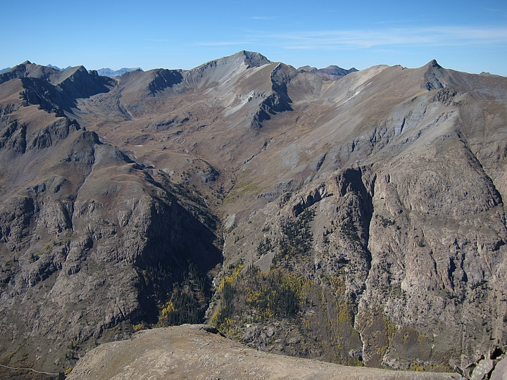 Looking north to Handies Peak, straight ahead, and UN 13795, pointed peak upper right.