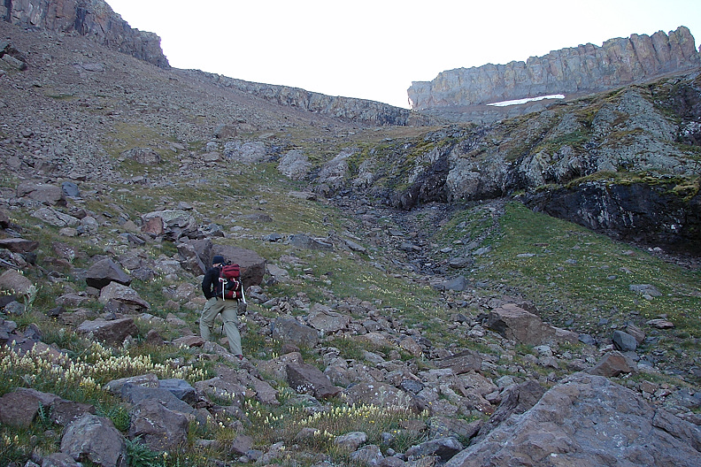 The sloping cliff bands between Redcliff (upper left) & Coxcomb (upper right) can be climbed on either side. We went to the left.