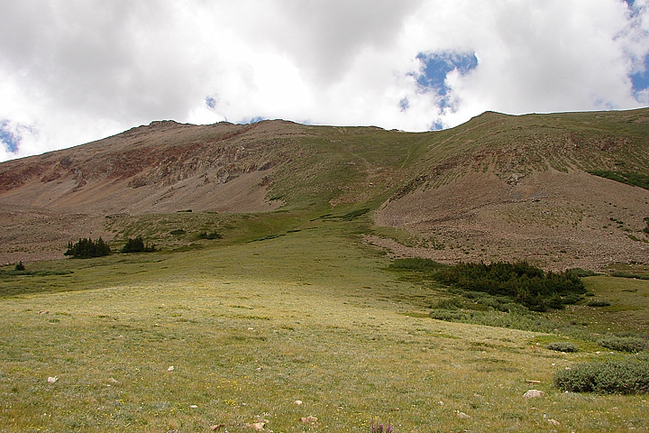 The route heads up the grassy drainage below the Rinker/Twin Peaks saddle, center.