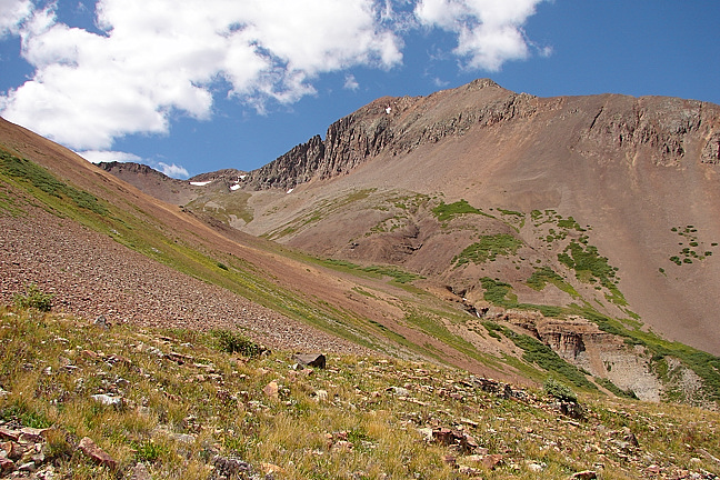 Contouring above the drainage to the saddle (with the snow patches). The summit is the high point to the right of the saddle.