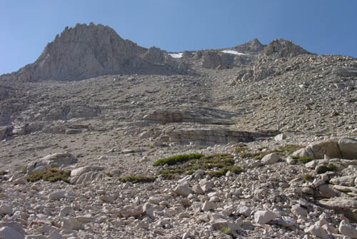 This view shows the slopes from the trail just before Upper Boy Scout Lake. The worn area above (and to the right) of the center cliff bands is the route.