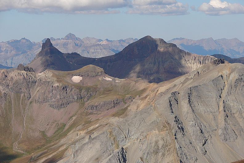 Coxcomb (left) and Redcliff (right), both shaded, from the summit of Silver Mountain.