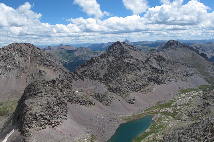 Upper left: Storm King Peak; lower foreground left to right: Peak Eight, Peak Nine; Mt Silex and The Guardian (right). Pointed peak on the horizon behind Mt Silex is the Rio Grande Pyramid.