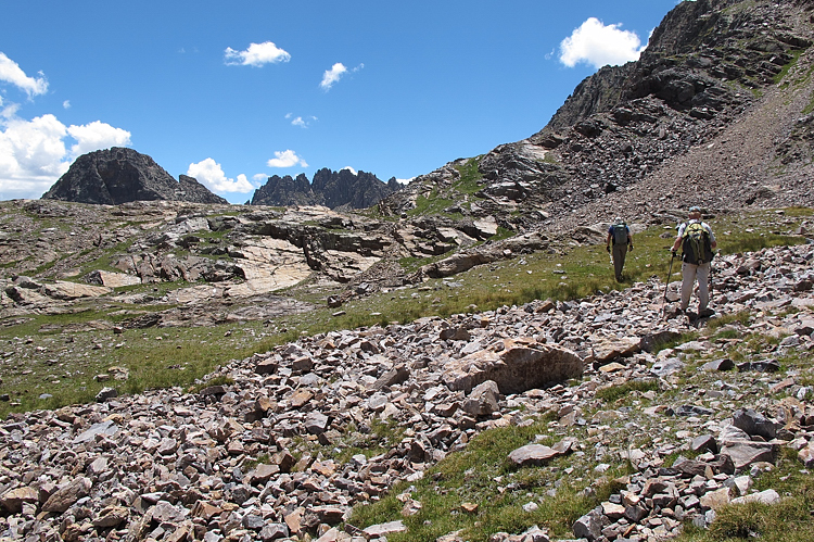 Our traverse brought us to a rock rib ahead and subsequent descent to the Peak Six gully. We're getting closer to Jagged Mountain as well, center.