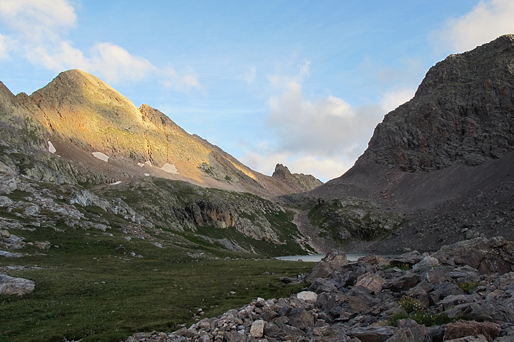 Approaching the lake at 12,460'. The sun is hitting Peak Seven.