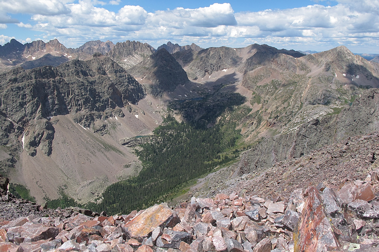 Looking into Leviathan drainage from The Guardian. Near left: Vallecito Mountain and to its right: Leviathan Peak. Jagged Mountain lies behind and slightly left of Leviathan Peak. Upper right is Peak Seven. To the left of Peak Seven is Peak Six, its summit in the shadow from the clouds, it's also to the right from Leviathan Peak's shadow.
