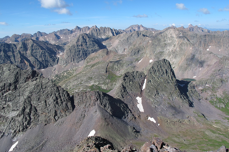 Left foreground: Peak Nine, right foreground: Peak Eight, to the right of Peak Eight is the small lake at 12,760'; above the lake is Peak Seven. Barely visible behind Peak Seven is Peak Six. Straight ahead and left of center is Leviathan Peak and behind Leviathan Peak, distant center, is Jagged Mountain.