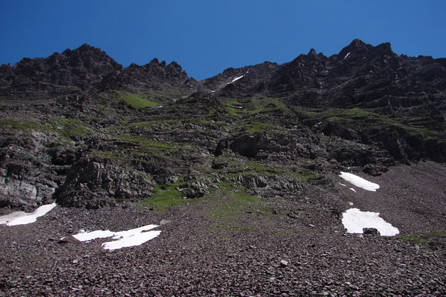 Thunder Pyramid is on the left side of the ridge in the distant background (center of photo and above long snow patch).