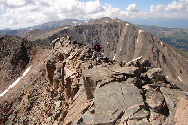 Tim leaving the summit, with Mosquito Peak (the rounded one) and Treasurevault Mtn (the pointed one), distant center right.