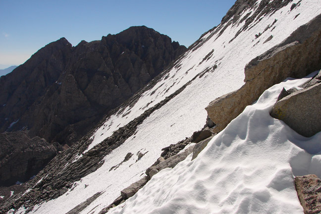This was where I put on crampons again to traverse past the rib to the gully. That's fourteener Mt Williamson in the background.