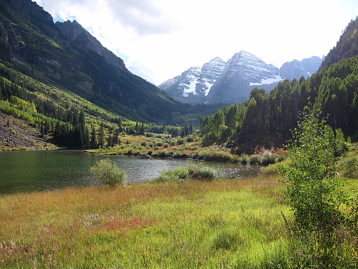 A serene view of the Maroon Bells from the west end of Maroon Lake.