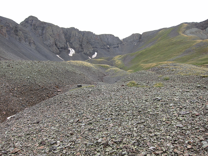 UN 13795 is upper left, the ascent gully, with snowbanks at the top, is straight ahead. We stayed on the grass to reach the ridgeline instead.